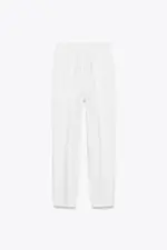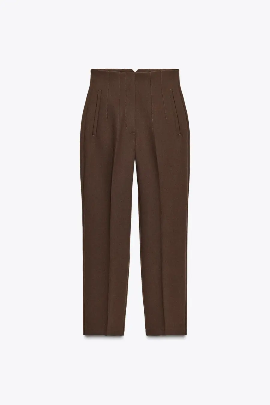 High-waist trousers with seam detail on the front and back. Front welt pockets. Front zip fly, inside button and metal hook fastening.