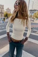 Long sleeve T-shirt with a square neckline. Ribbed fabric. Straight hem.